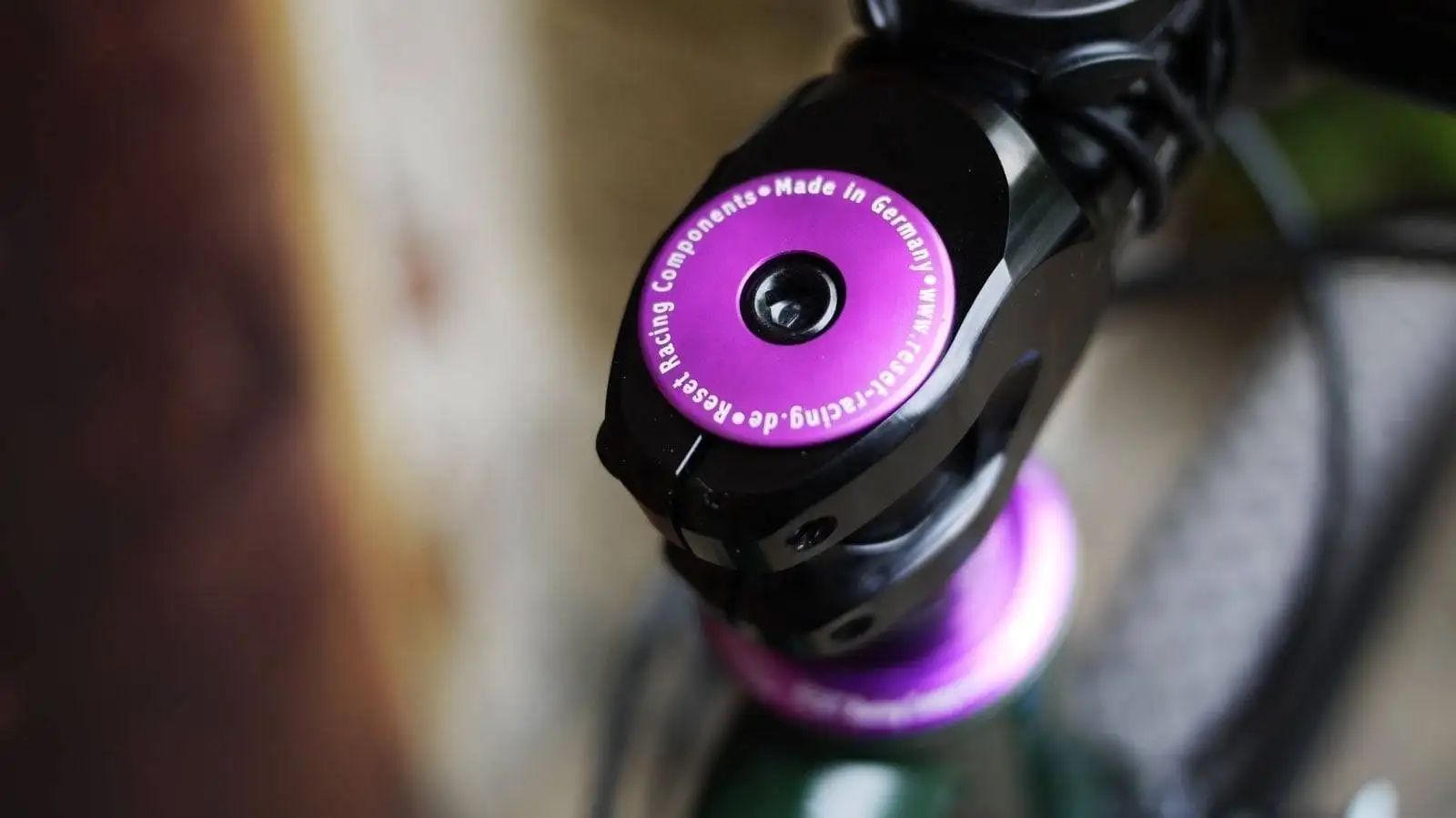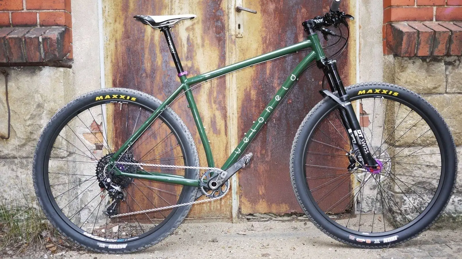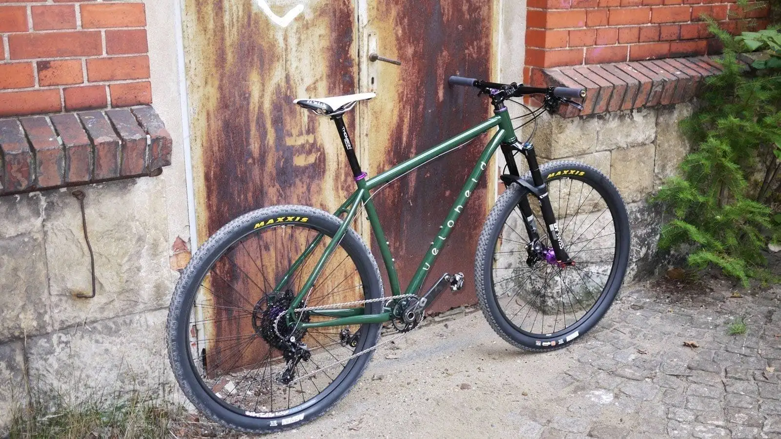 A crazy combination – this 29er veloheld.iron MTB was given a fir green coating (RAL 4009) with black reflective decals. The frame was then built up with purple anodized parts from Hope, Reset Racing etc.. An unusual color combination. Often you can’t imagine such variations, but we are all the more pleased about such “crazy” projects.