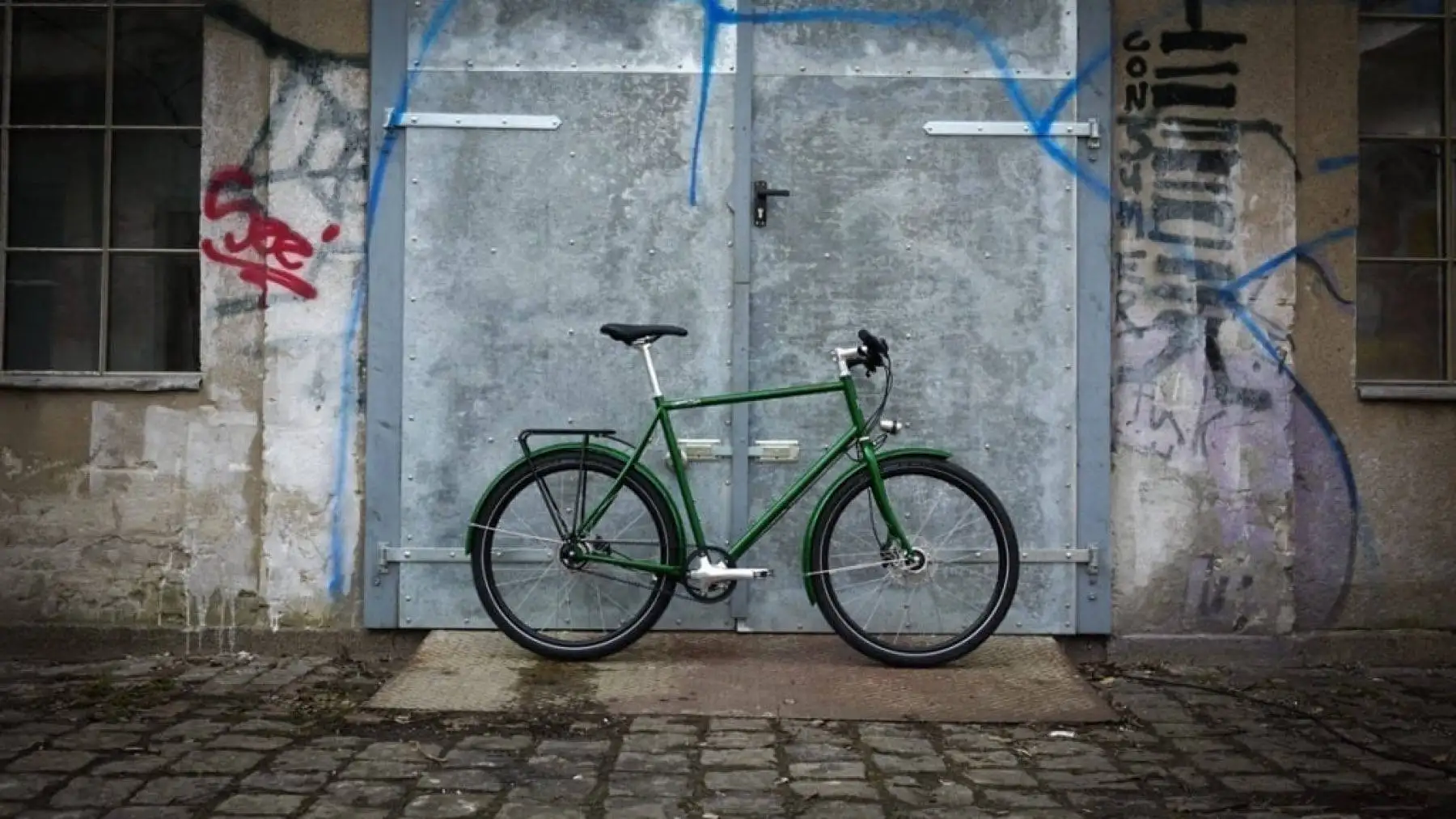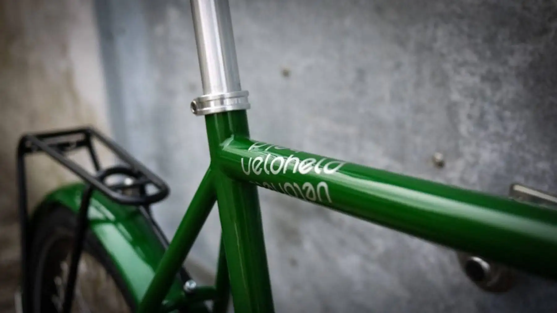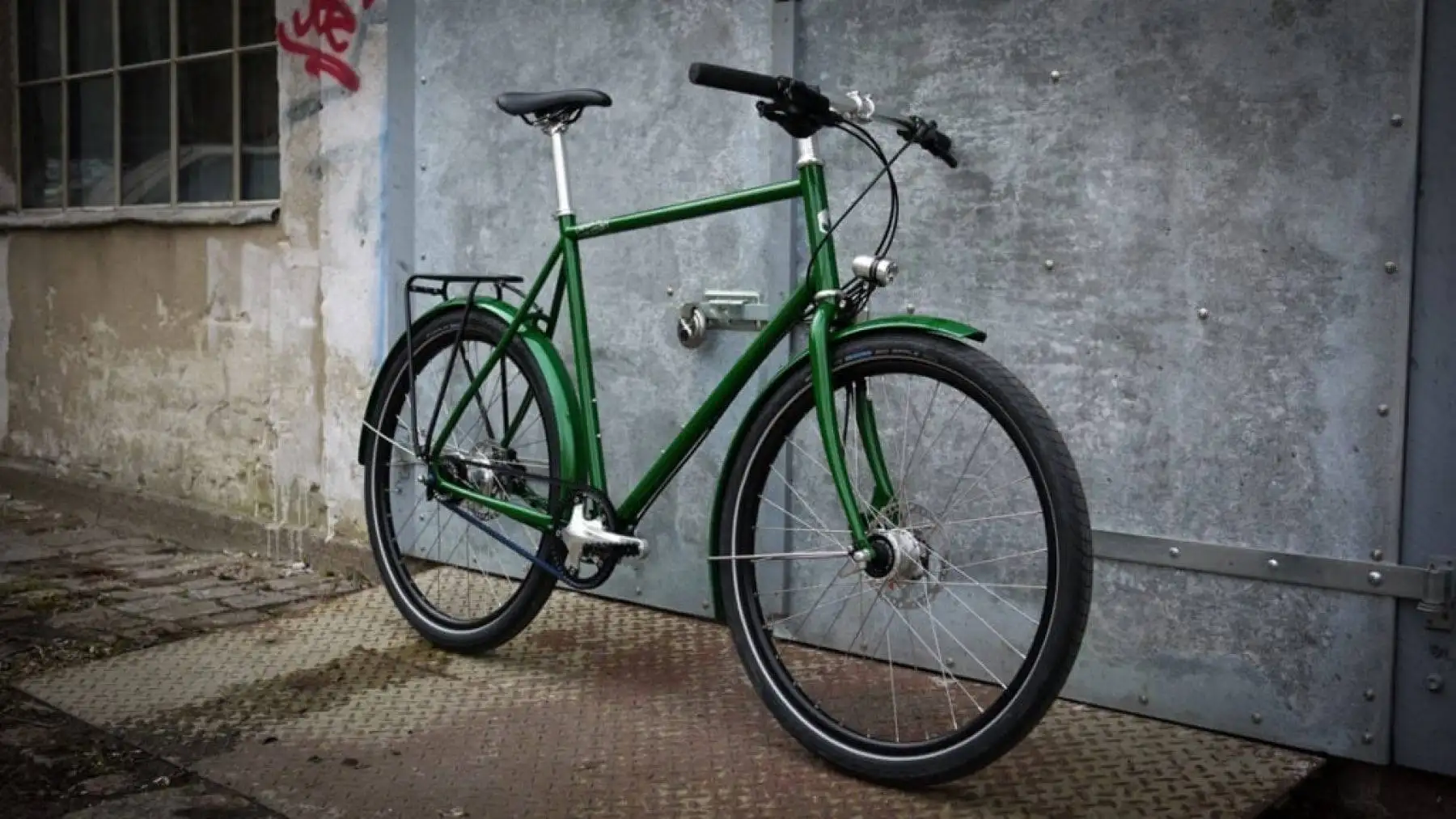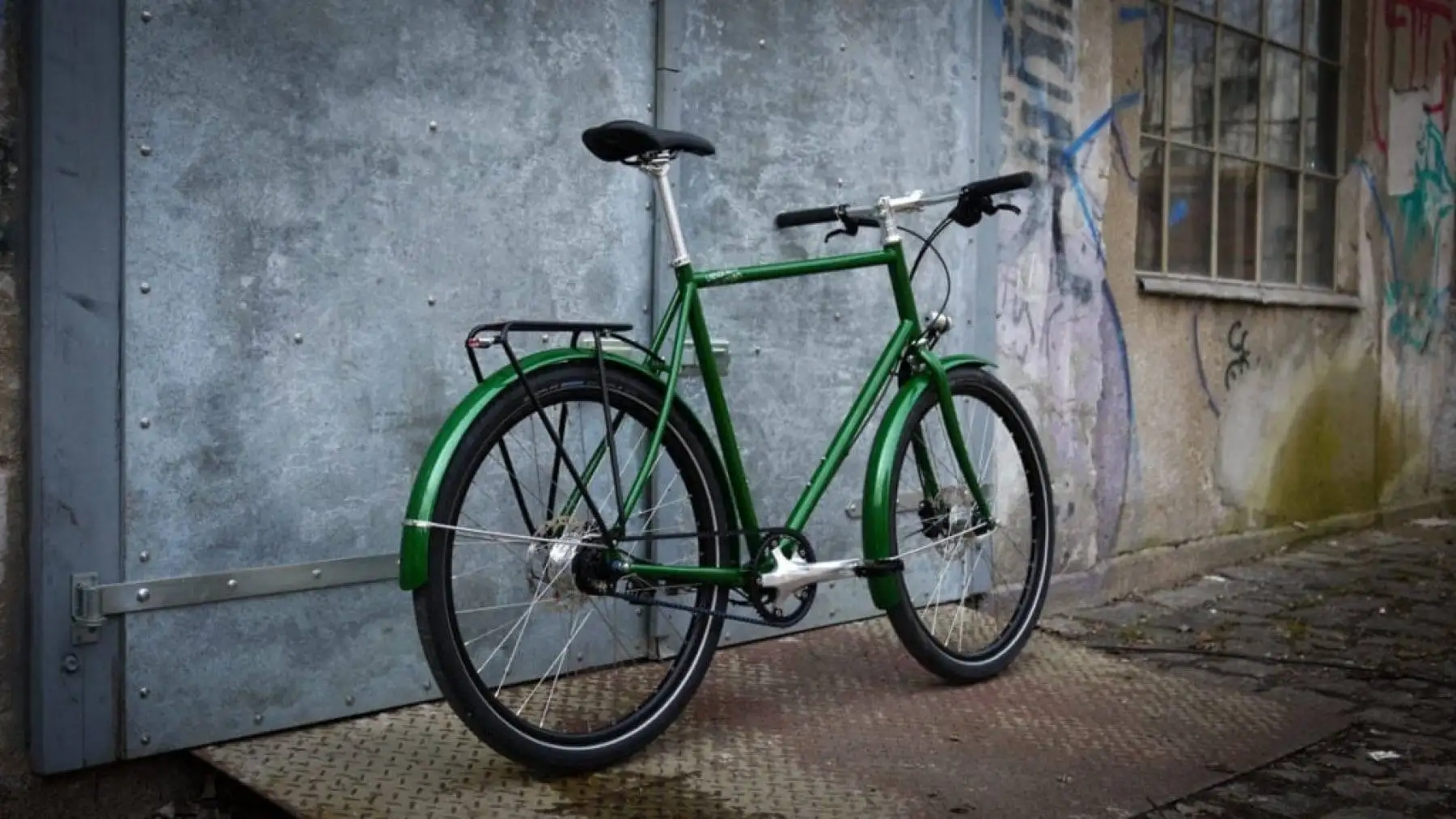 This special veloheld.lane in size XL and powder color RAL 6035 pearl green got smaller wheels in 26 inch. This made it possible to install Schwalbe Big Apple tires in 50 mm width. We also needed some special mudguards from Gilles Berthoud, which were also powder-coated in the same color as the frame. The rest of the components are as in the series, only in polished aluminum, such as the Shimano Alfine 11-speed hub (in conjunction with the Gates Carbon Drive belt drive), stem, handlebars, seat post, etc..