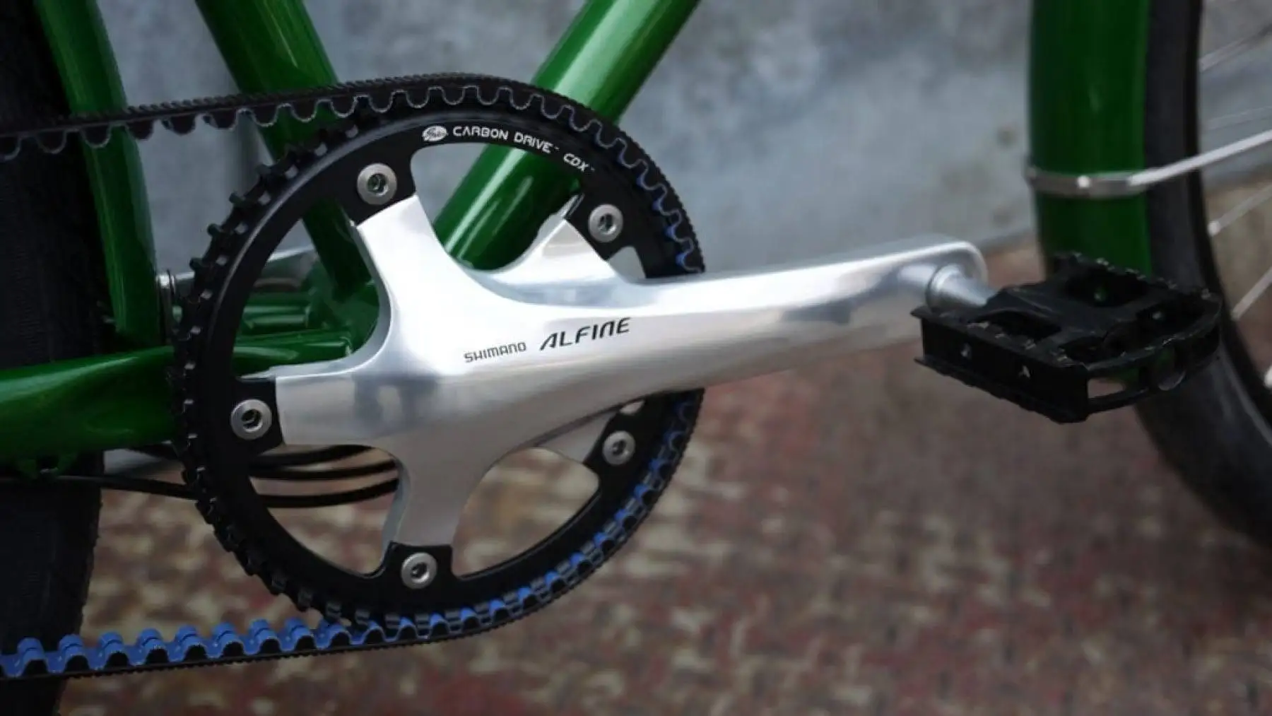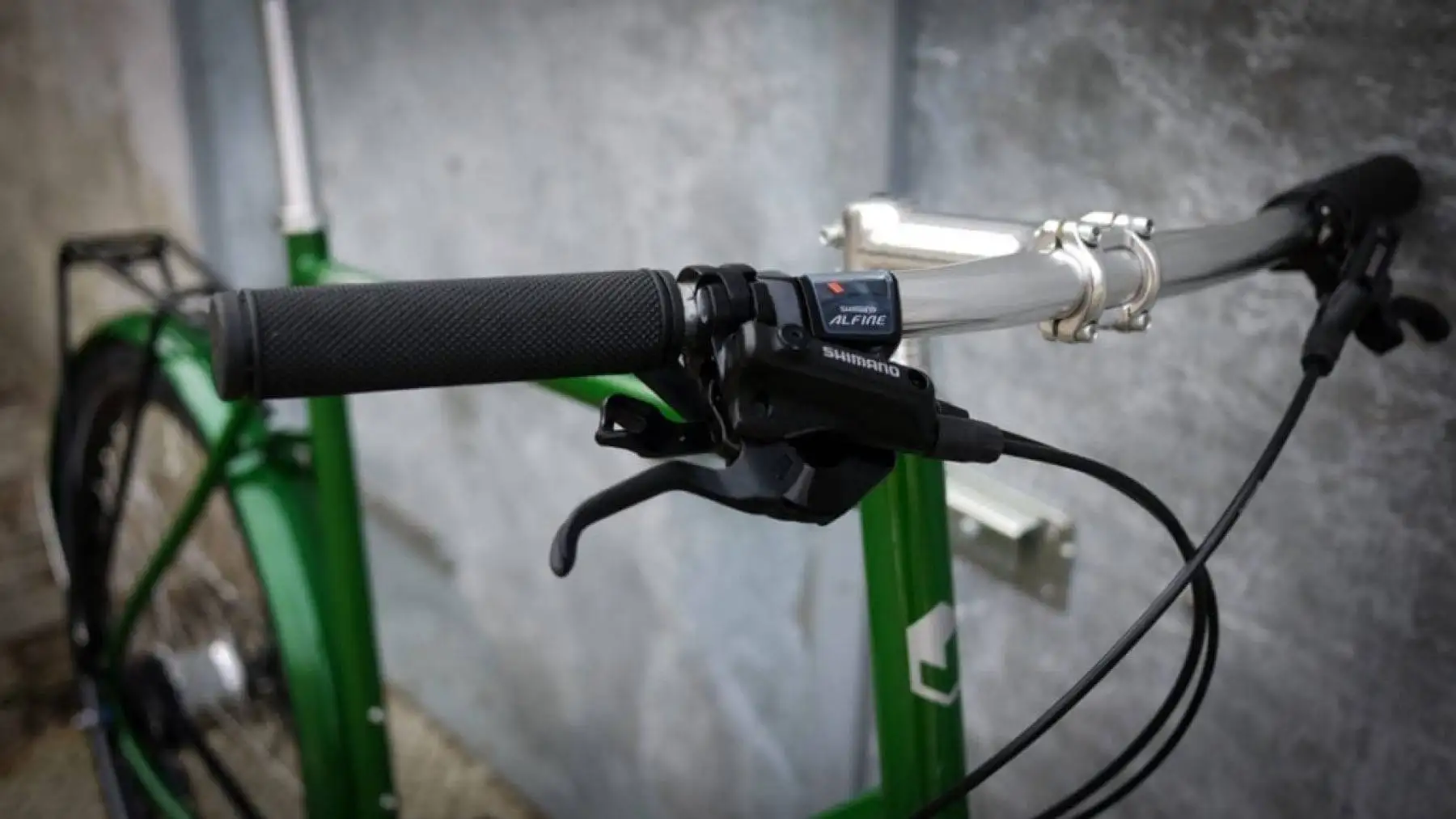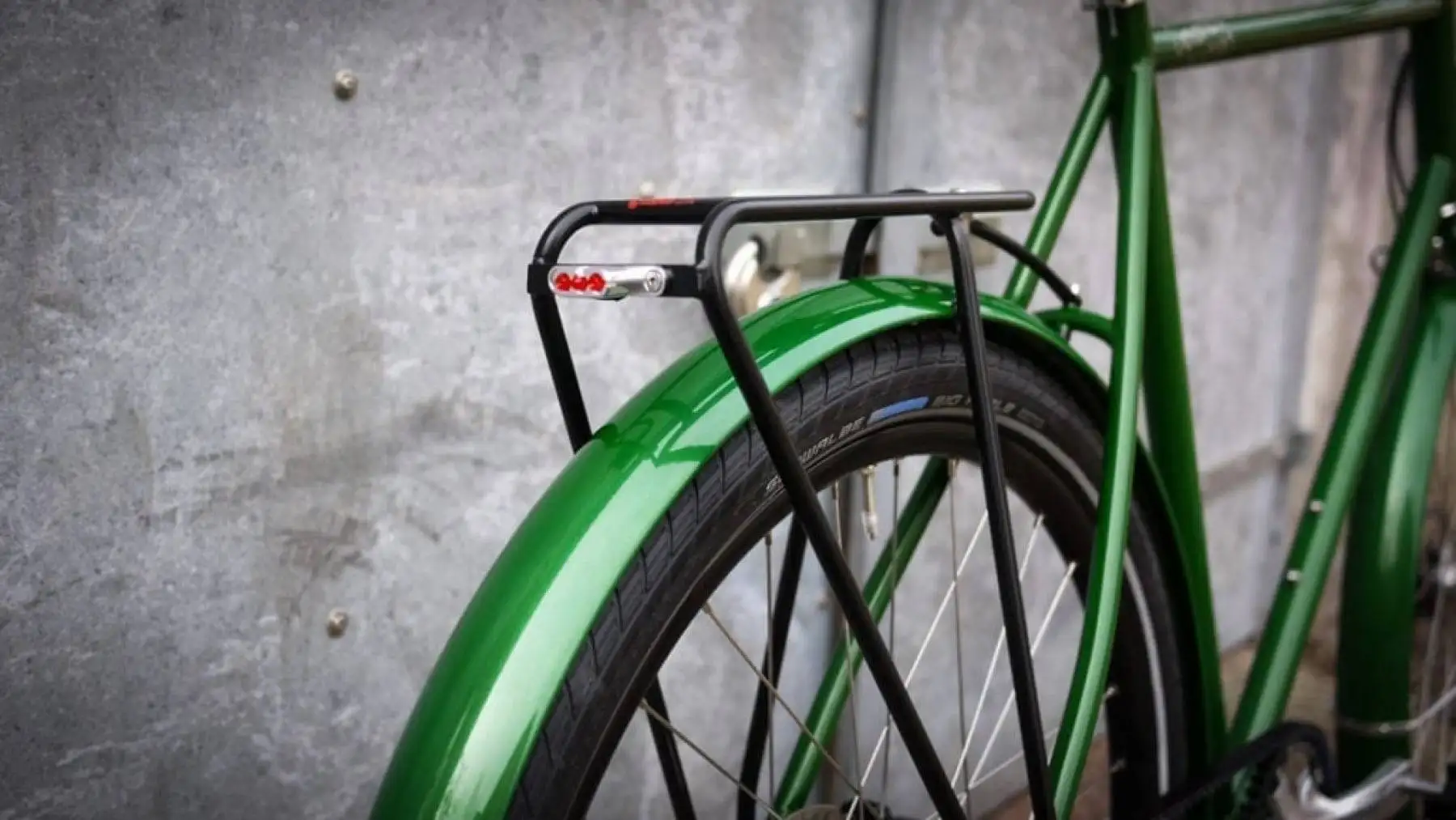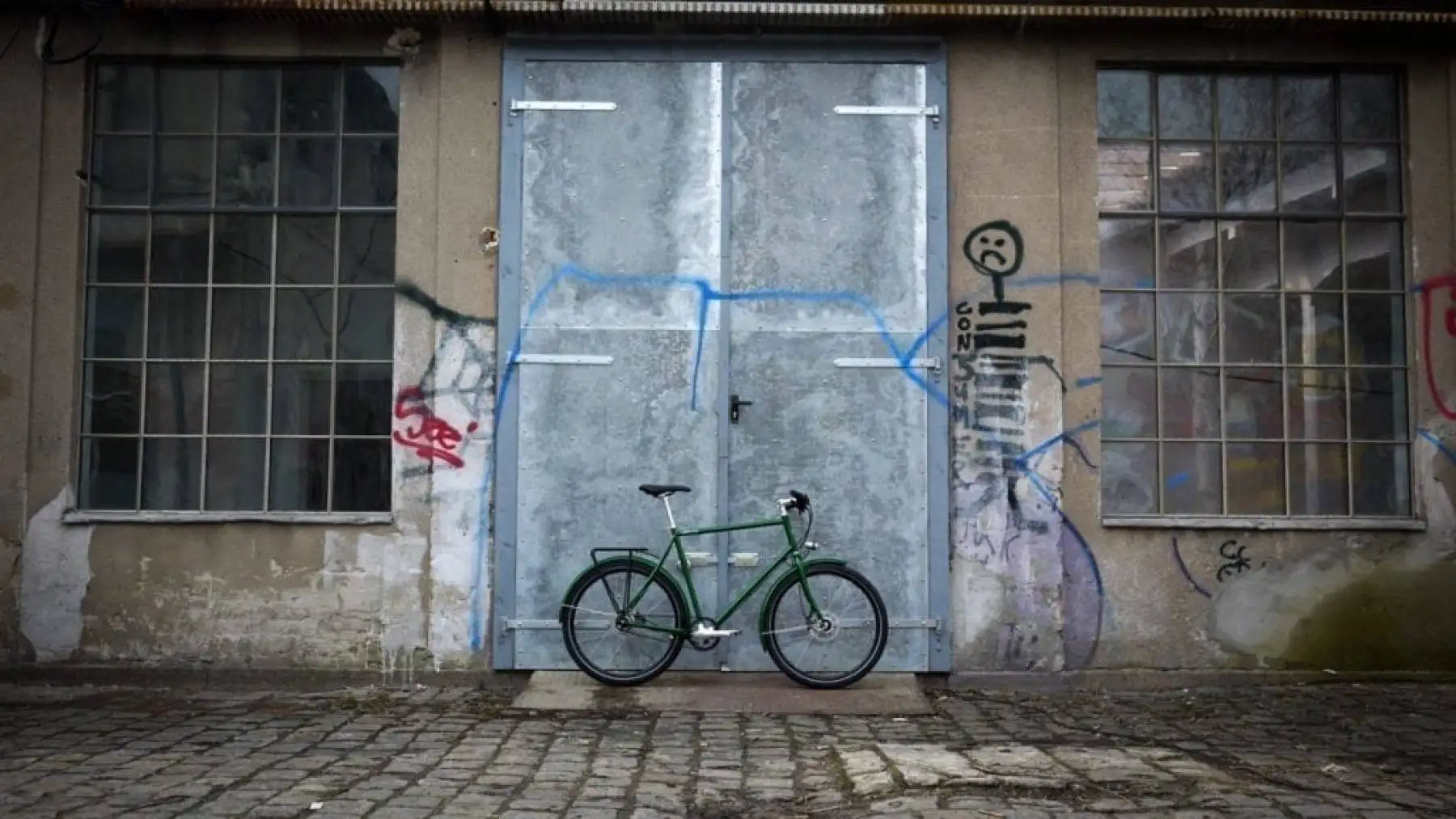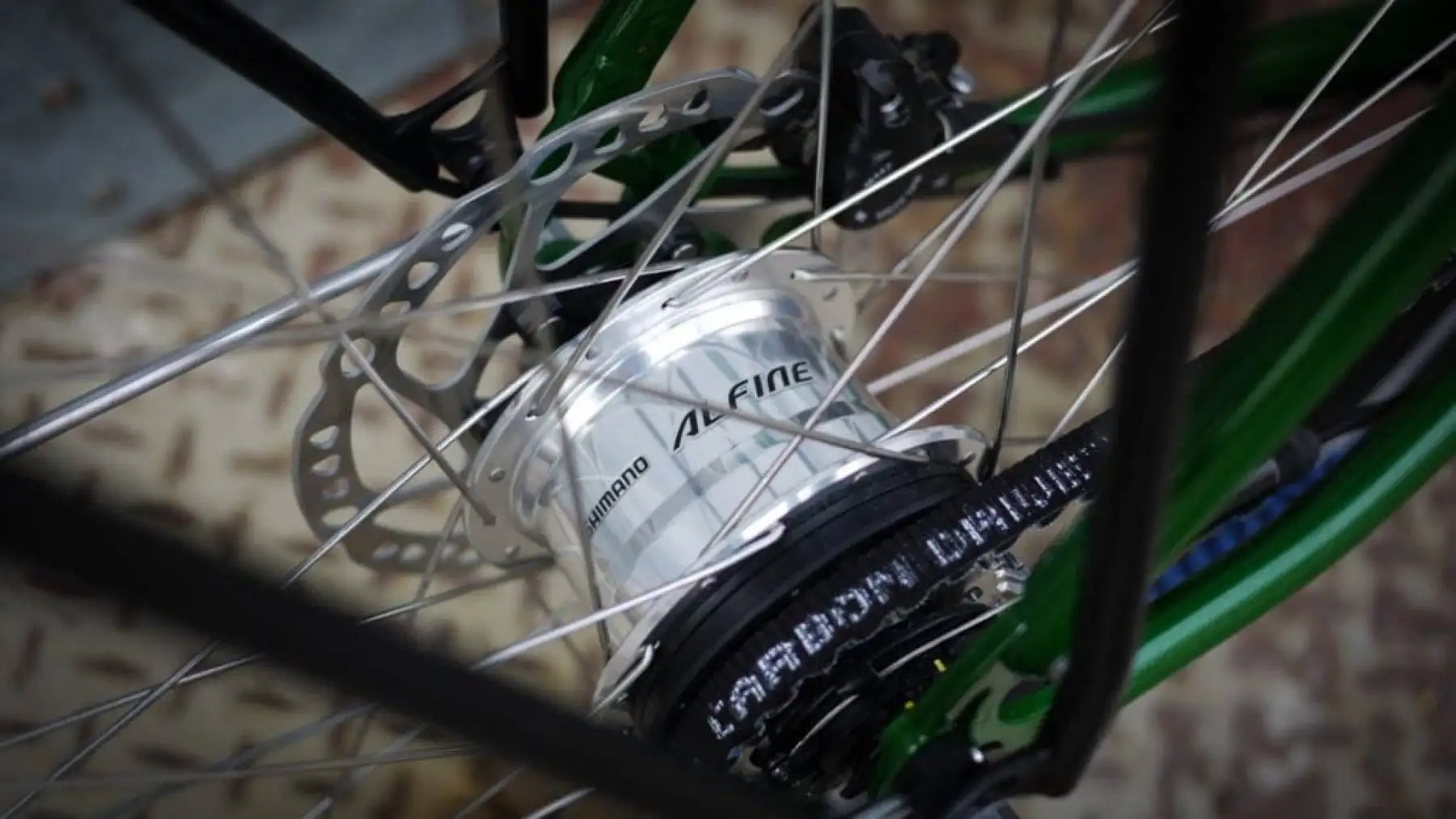 This special veloheld.lane in size XL and powder color RAL 6035 pearl green got smaller wheels in 26 inch. This made it possible to install Schwalbe Big Apple tires in 50 mm width. We also needed some special mudguards from Gilles Berthoud, which were also powder-coated in the same color as the frame. The rest of the components are as in the series, only in polished aluminum, such as the Shimano Alfine 11-speed hub (in conjunction with the Gates Carbon Drive belt drive), stem, handlebars, seat post, etc..