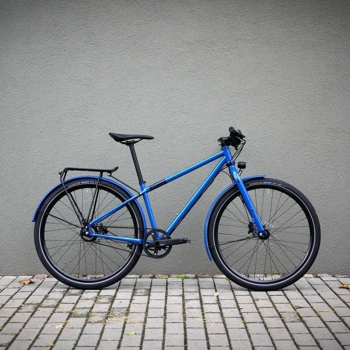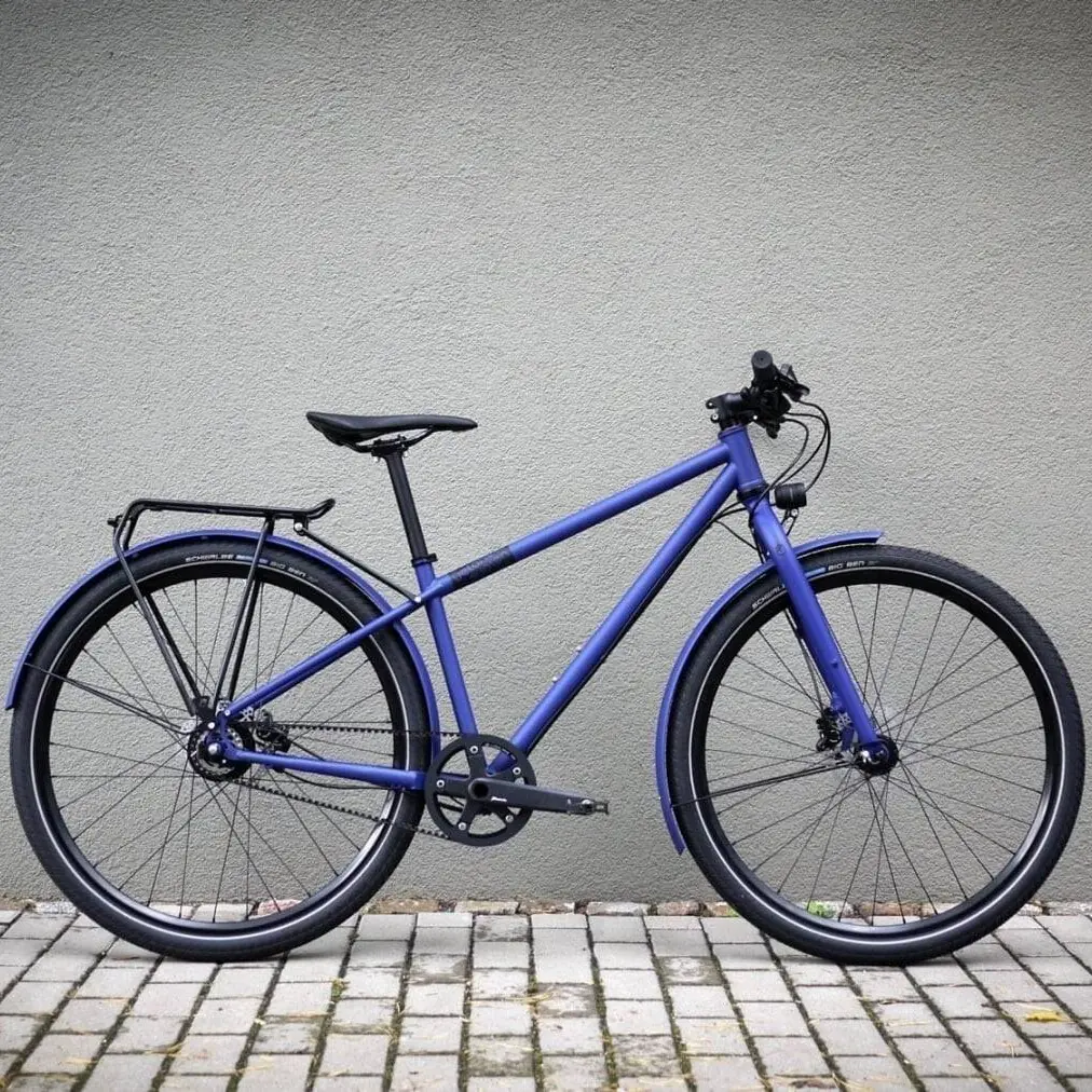 This veloheld.lane has been powder-coated in blue green (RAL 6004) and fitted with lots of “shiny parts”. These include H Plus Son rims, Supernova lighting and many other components. With the Gates Carbon Drive Center Track drive in combination with the Shimano Alfine 11-speed hub, the bike is low-maintenance and fast for many tours in and out of the city.