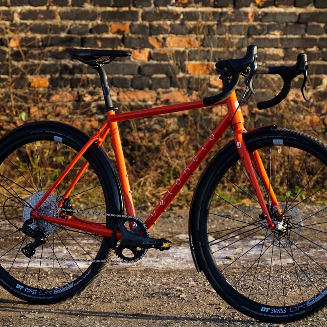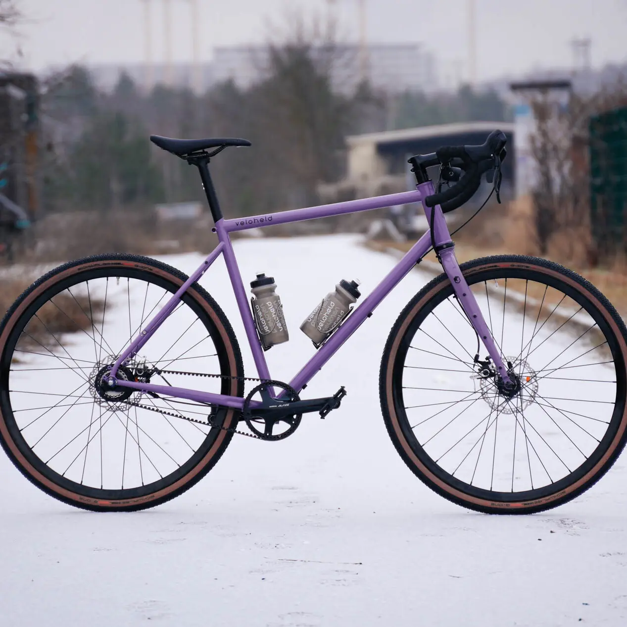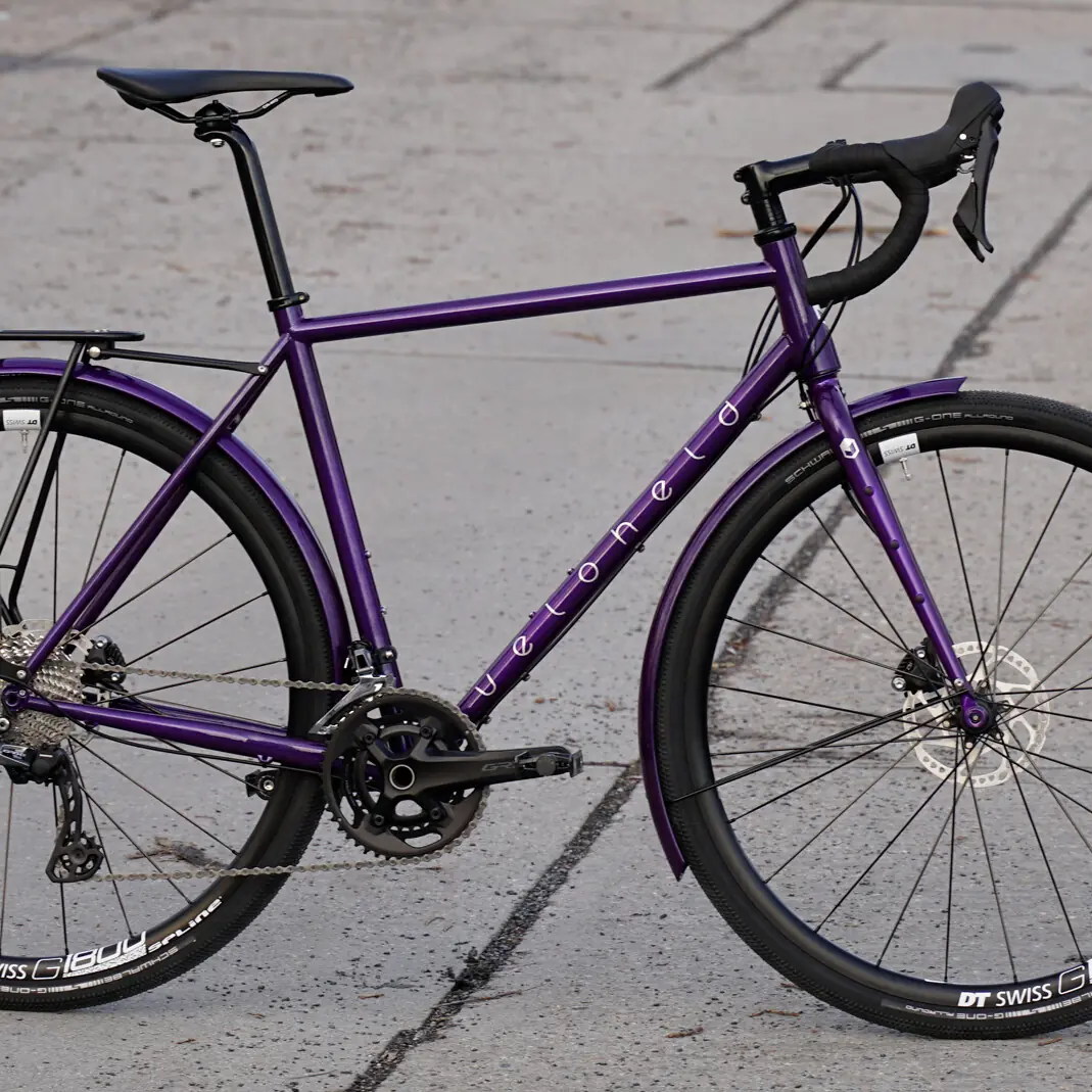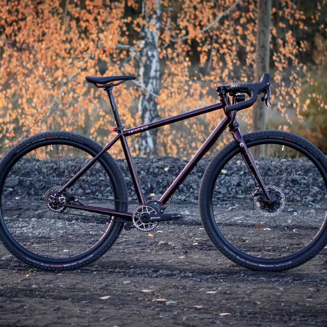 Here comes a cute little veloheld.path city bike / touring bike in size S and powder-coated in the beautiful desired color Bordeaux violet (RAL 4004). All attachments correspond to the standard bike – Gates Carbon Drive belt drive in combination with the Shimano MTB Alfine 8-speed hub, Supernova Lighting Systems lighting system, Racktime pannier rack and Schwalbe tires Big Ben tires in size 27.5″ / 50 mm.