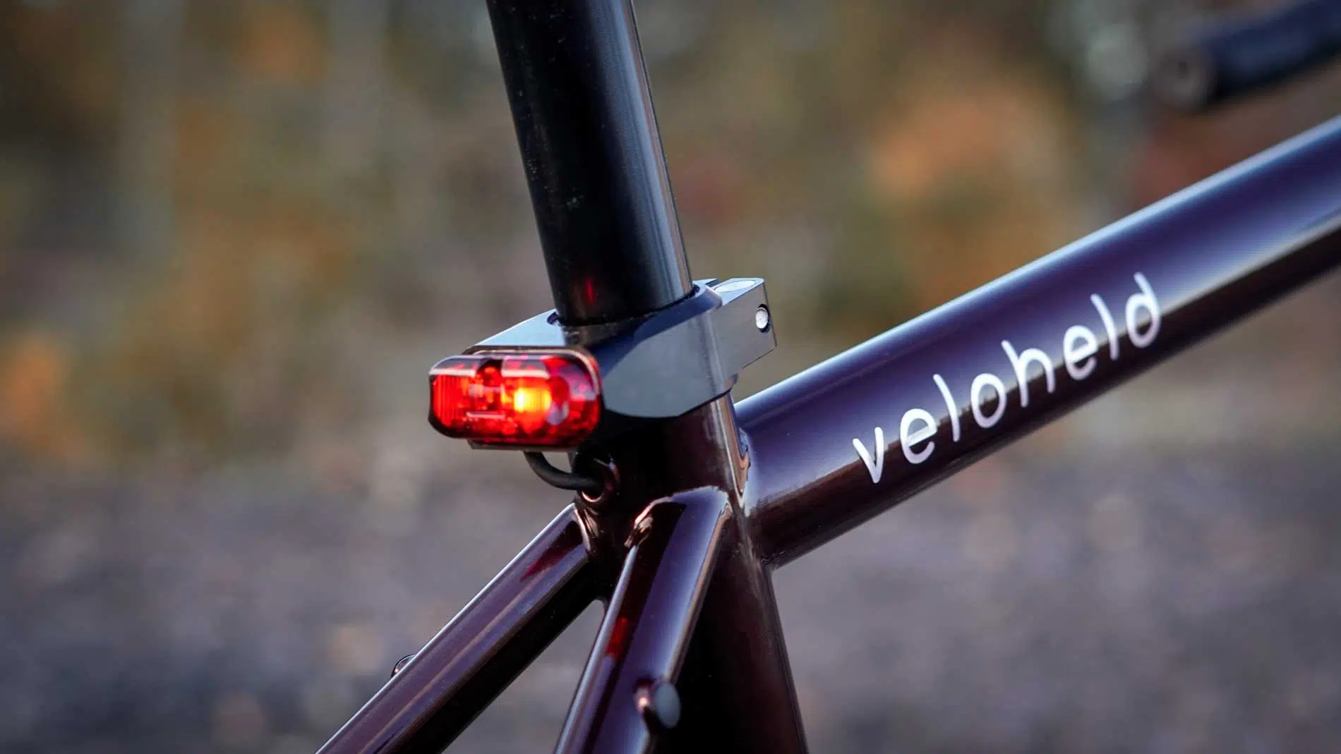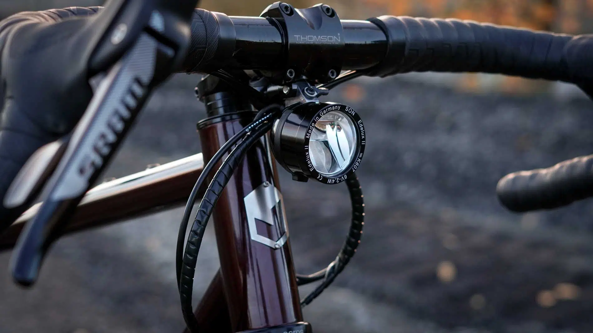 As installed on the “sample” bike, for example, it is difficult to ride with a bag directly on the handlebars, as the lights would be covered. The new seat clamp light from SON with the light cable running inside the frame also requires a ø 26 mm seat post, which unfortunately minimizes the availability of seat posts.