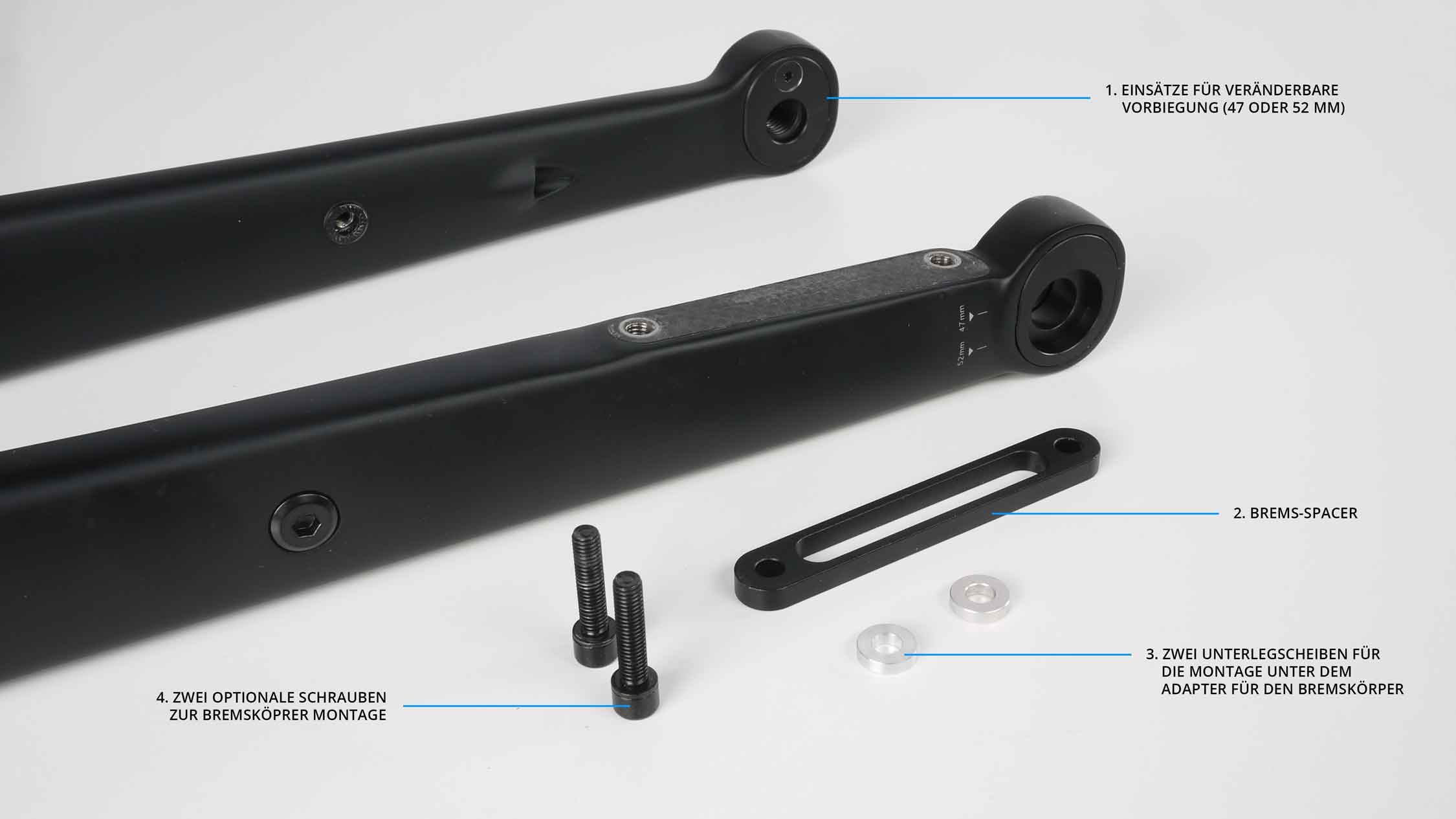 To change the riding characteristics, you can change the fork offset between 47 or 52 mm. To do this, the inserts in the dropouts must be rotated and a spacer must be installed under the brake adapter. We recommend 52 mm fork offset up to frame height M and 47 mm fork offset from L for a more balanced trail.