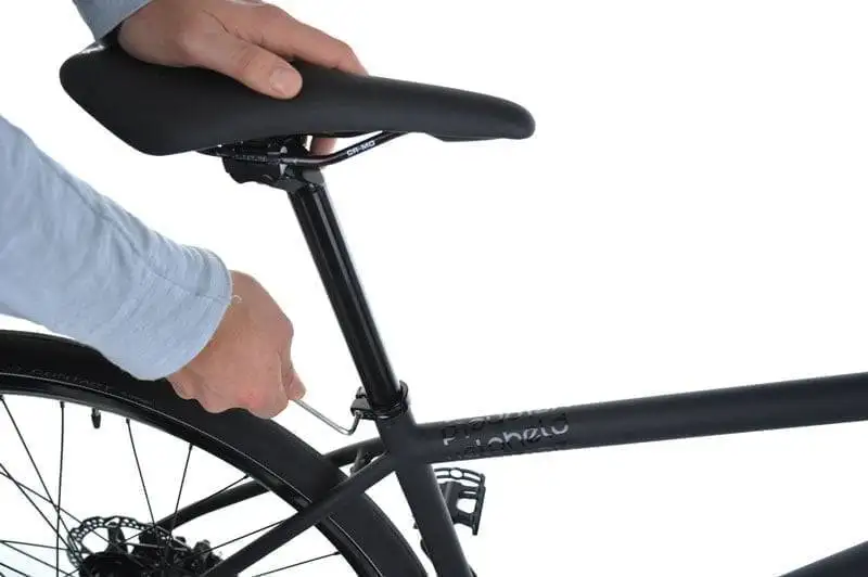 The saddle is already in its correct position in the frame and only needs to be adjusted to your individual height. As an initial height reference, we recommend transferring the saddle height from your old bike. To do this, measure from the center of the bottom bracket to the top edge of the saddle in the middle of the saddle and then transfer this height to your new Veloheld. First loosen the bolt of the seat post clamp on the frame with the 4 or 5 mm Allen key and tighten it again with 5-6 Nm after adjustment. During this process, make sure that the seat post is not pulled beyond the maximum mark.