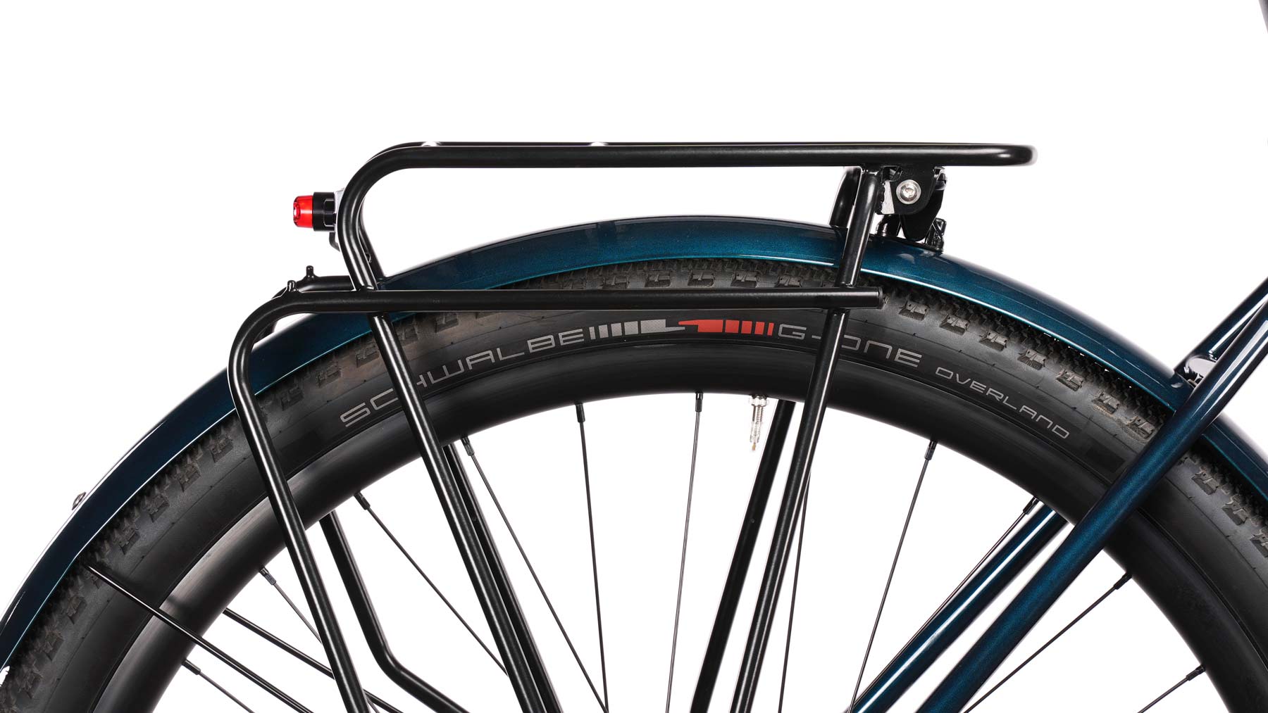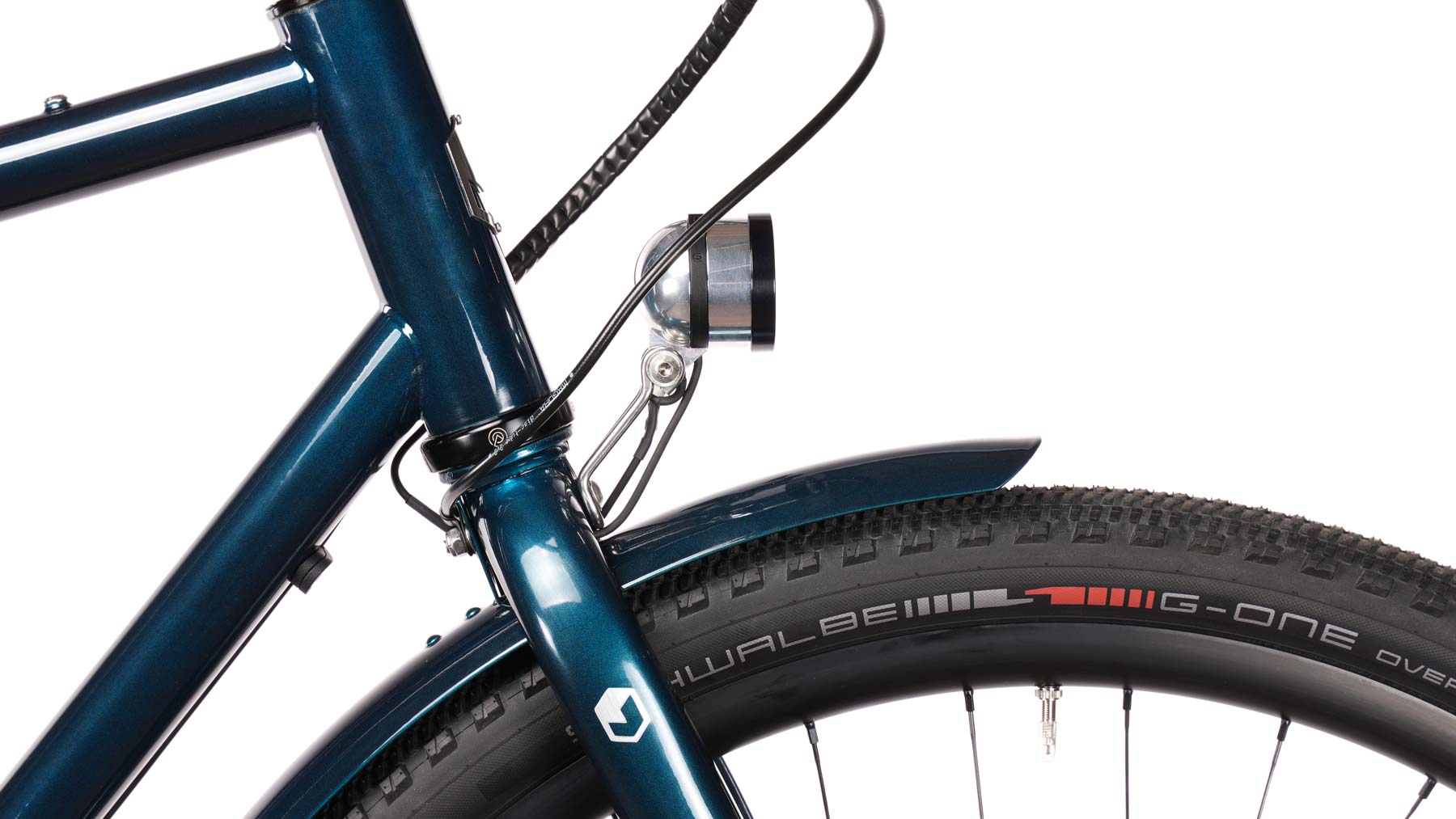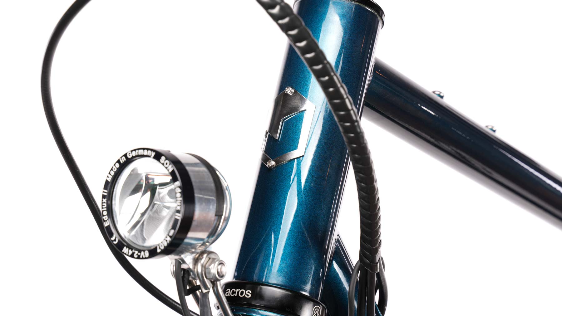 The veloheld.farway Pinion Tour is your new touring bike for wonderful tours. Precisely manufactured in our frame construction workshop in Leipzig, it offers a robust and comfortable CrMoly frame, a 12-speed Pinion gearbox in conjunction with the low-maintenance Gates Carbon Drive belt drive and the bright SON lighting system.