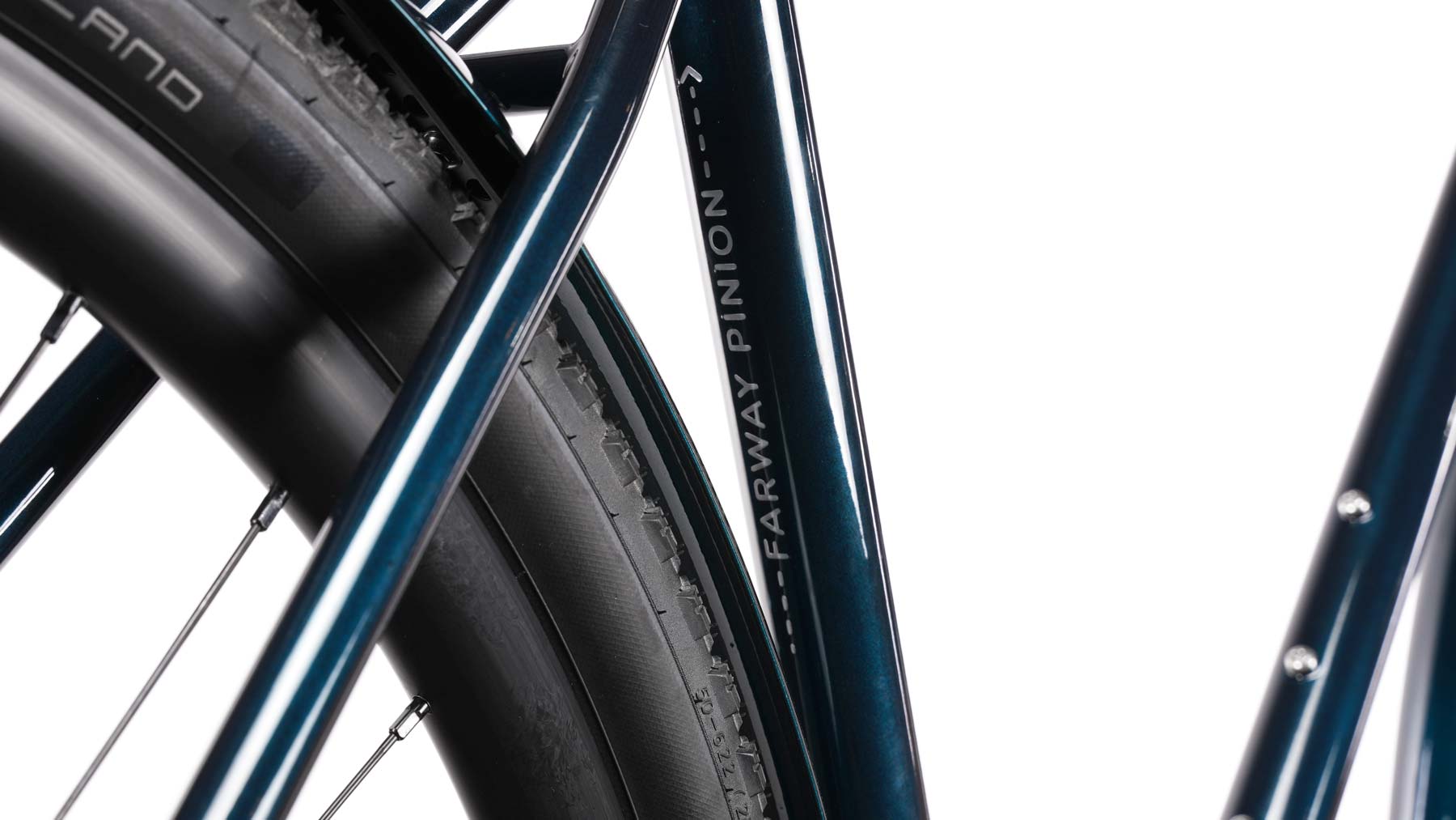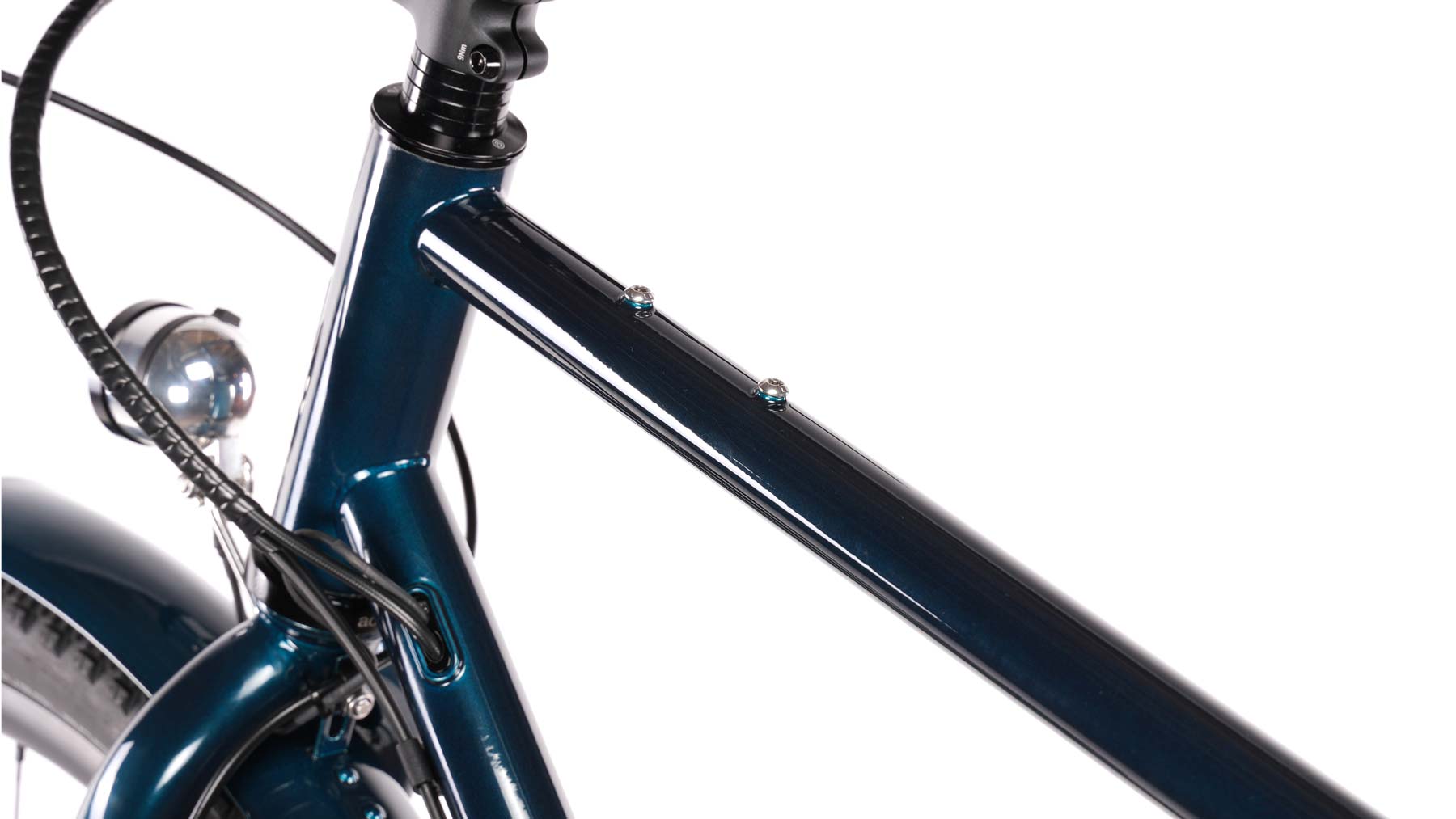 double end-reinforced tubes made of 4130 CrMoly (25CrMo4) steel, TIG-welded, stable 44 mm head tube, stainless steel thru-axle dropouts with internal flat-mount disc brake mount and preparation for KSA 18 kickstand mount (with adapter), frame lock on dropout for Gates Carbon Drive, brake cable routed in down tube, external Pinion gear cable, 3 bottle cage mounts, eyelets on the top tube for the fixed mounting of a small bag