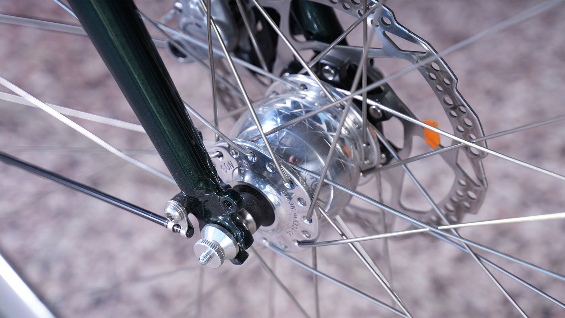 - New bike with Rohloff Speedhub 14-speed, SON lighting system, steel fork, mudguards and pannier rack in size S in the colour “Emerald Green” glossy with decor in silver