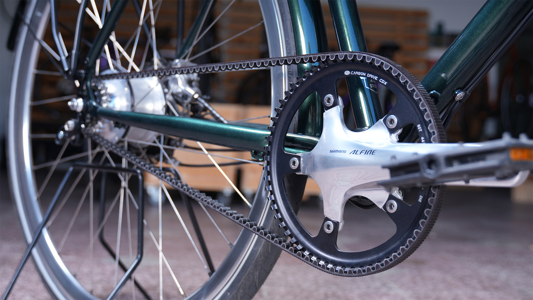 - Frame: double end-reinforced tubes made of 4130 CroMoly steel, TIG-welded, EBB eccentric bottom bracket housing for tensioning the belt, stainless steel