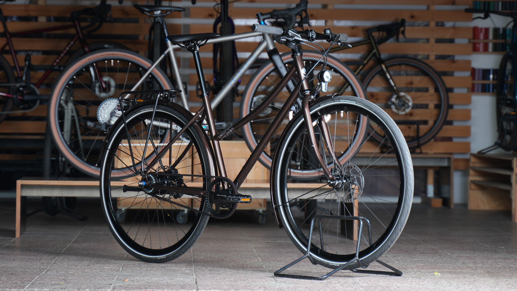 - test bike (with slight signs of use, small dent on top tube) with SON lighting system, steel fork, mudguards and luggage rack in size S in the colour ‘Misty Copper’ glossy with silver deco