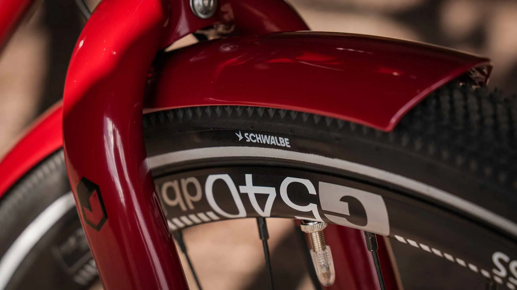 This veloheld.iconX comes equipped with the SRAM Rival AXS XPLR 1×13-speed drivetrain—electronic, low-maintenance, and reliable. Just the thing for a bike that’s on the road every day and needs no excuses. Plus, a SON hub dynamo with a DT 370 hub and G540 wheels—lights that always work because they don’t rely on a battery. That’s the kind of reliability we like. Schwalbe G-One Allround 40-622 tires—wide enough for gravel, fast enough for the city. And then there are the fenders. 50 mm, in frame color.
