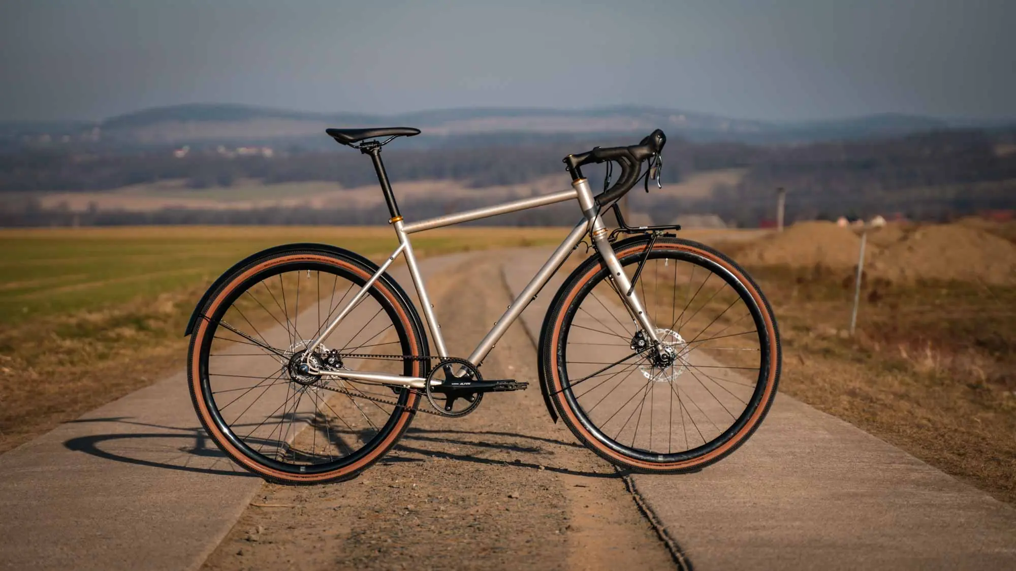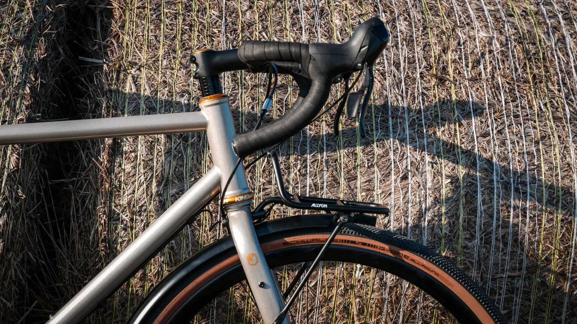 The steel frame comes in a warm silver-gray with a slight bronze tone. Understated, timeless, and precisely that strong. Add to that golden accents—subtle and very deliberately chosen. A look that works both on your daily commute through the city and on long gravel rides.