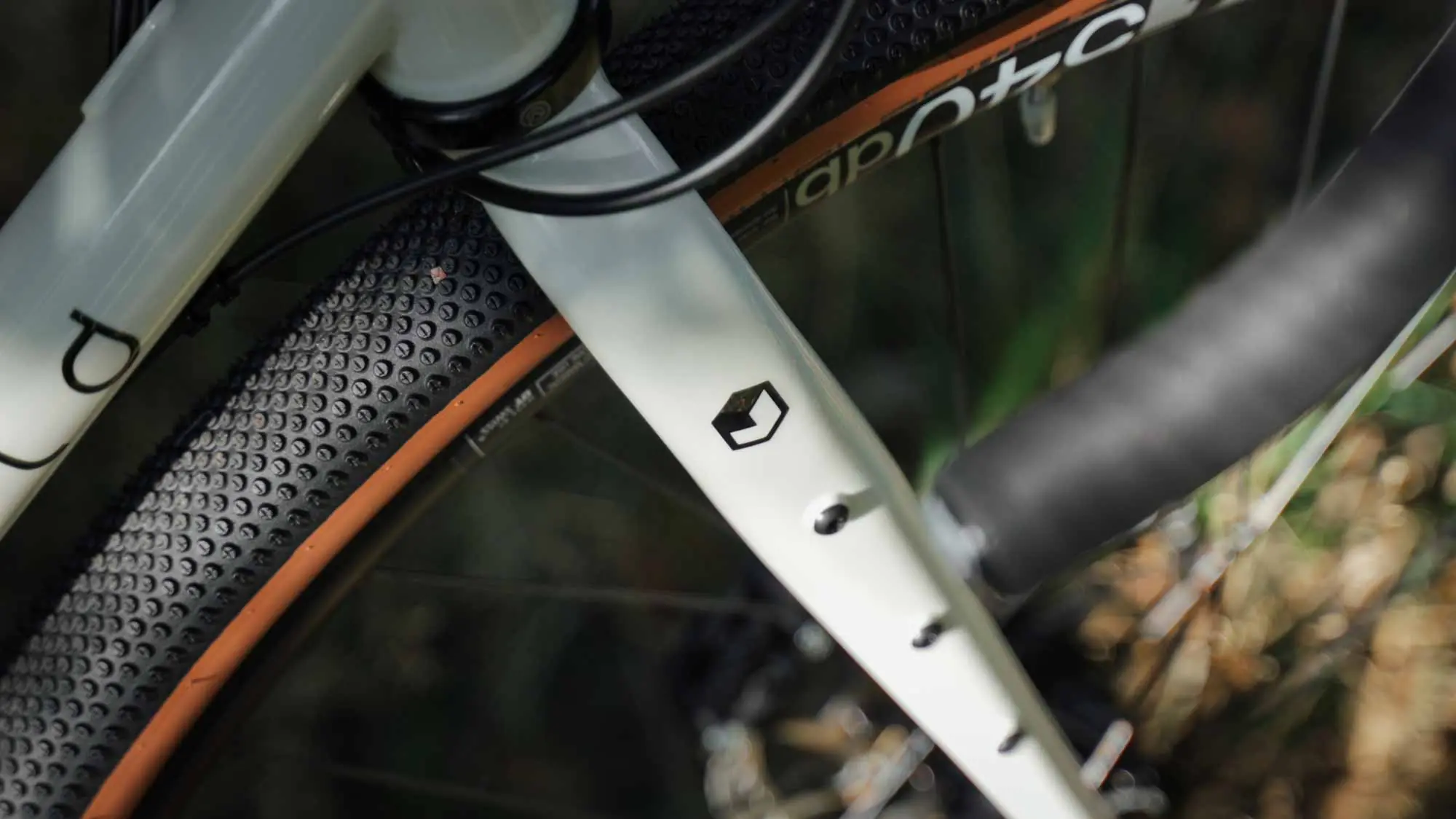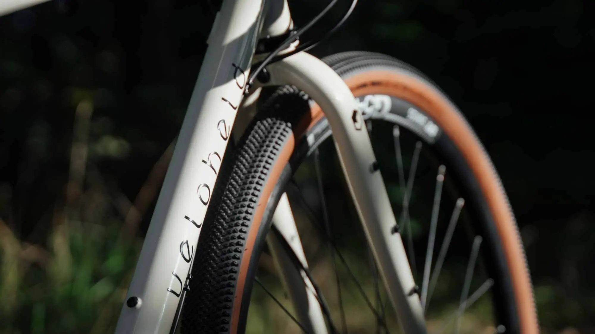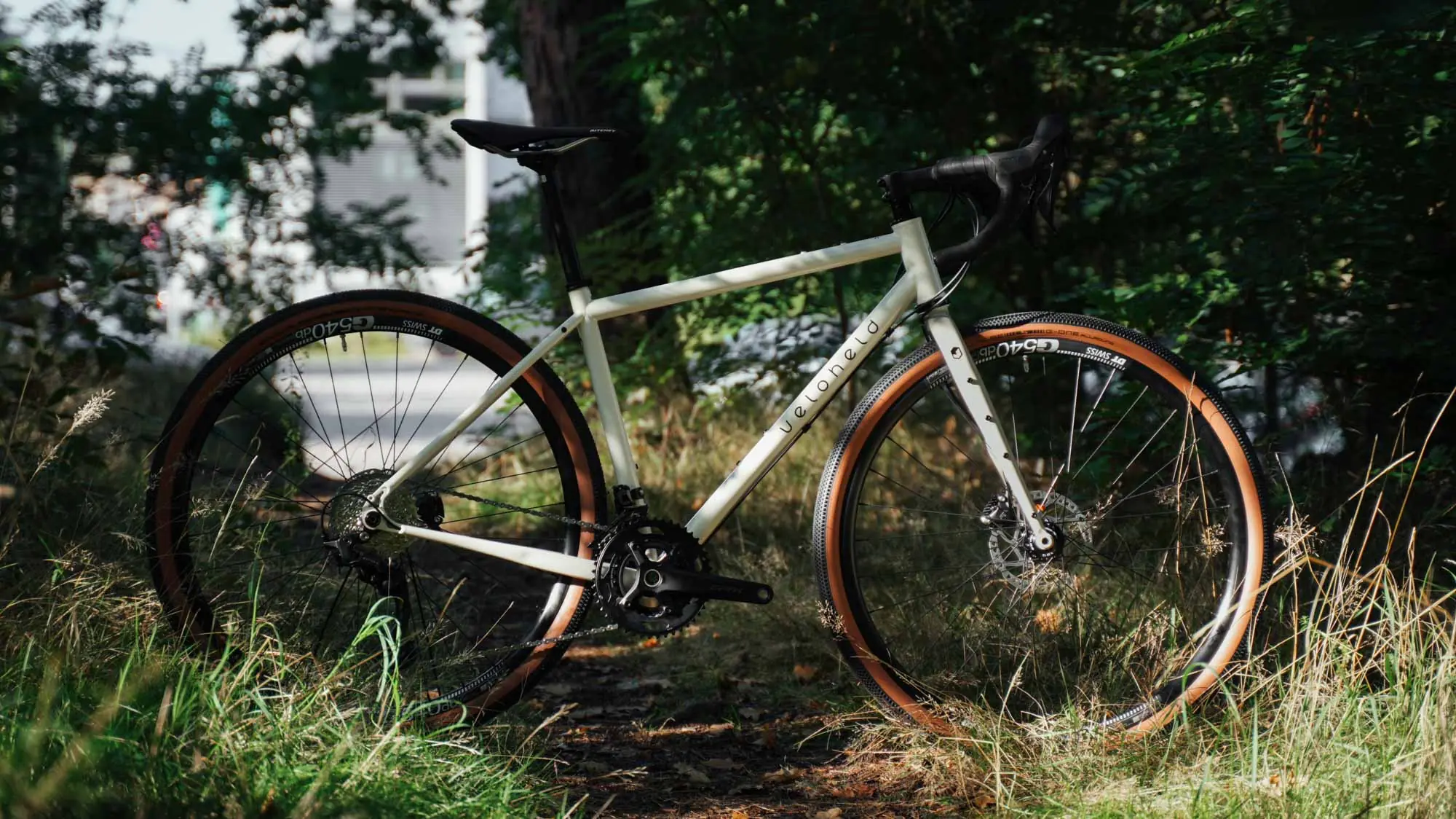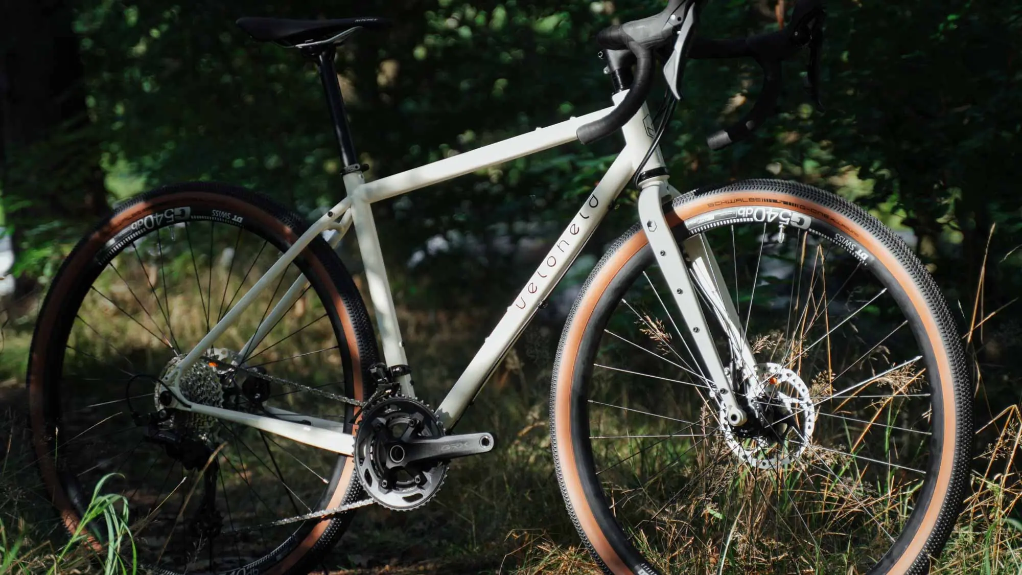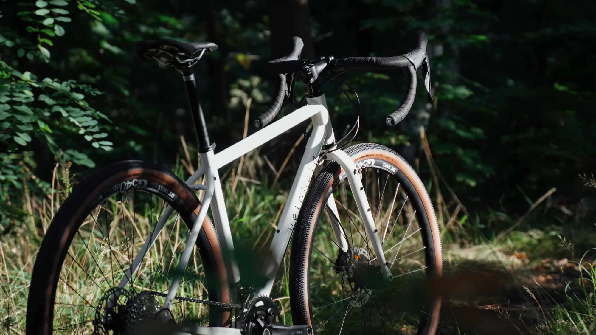 Gravel bike veloheld.iconX in cream white - logo and front tire